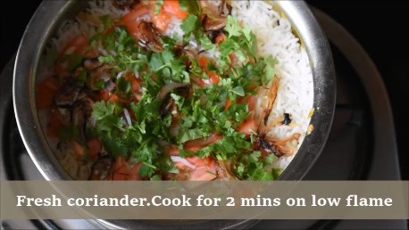 - Sprinkle some tomatoes,fried onions,coriander and mint. Also add saffron water and sprinkle.1 tablespoon fried onions(birasta), ½ cup coriander leaves, 8 nos mint leaves, 1 medium tomato, ¼ cup saffron milk